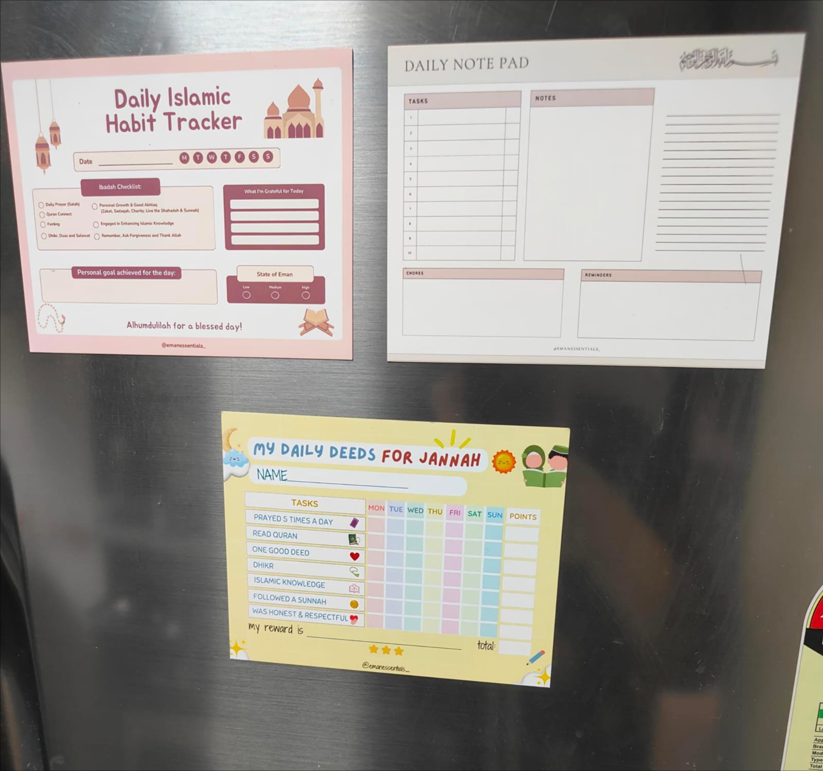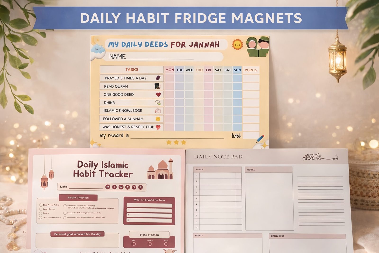 - My Daily Deeds for Jannah (Kids): A colourful, reward-based magnetic habit tracker created to nurture Islamic habits in children.