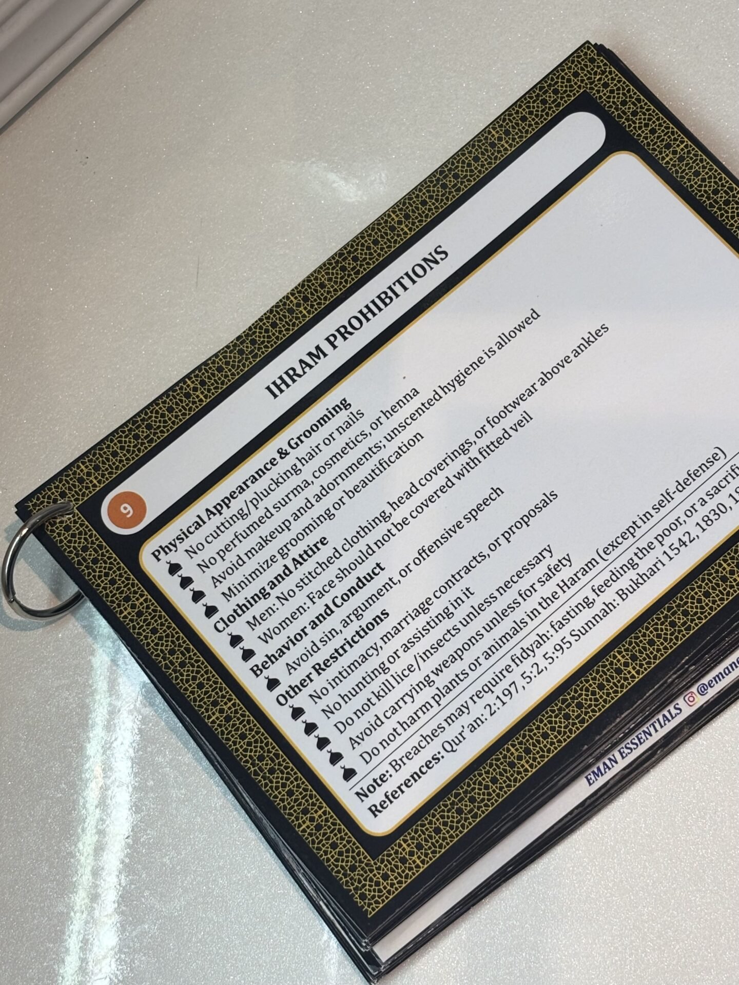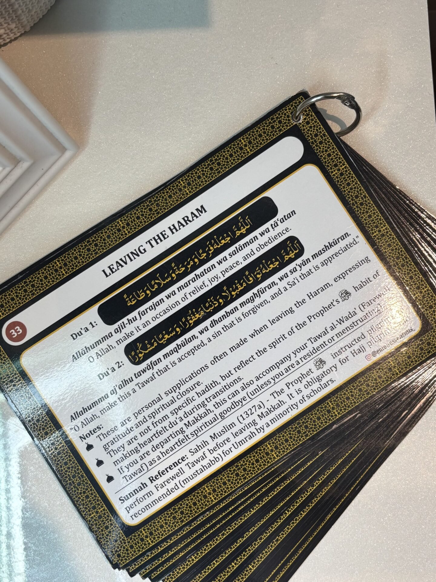A6 size | 24 Cards – 48 pages | Arabic + Transliteration + English | 300 GSM premium matte finish | Color-coded & Checklist-based | Ring-bound | Kaaba-inspired design | Large, easy-to-read fonts | Reflection Inserts Included